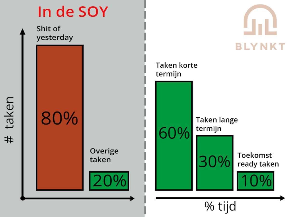 De belangrijkste vraag is natuurlijk: hoe kom je uit deze situatie? Hoewel je afhankelijk bent van factoren zoals je manager, team en organisatiecultuur, begint verandering altijd bij jezelf. Bewustwording is hierbij essentieel. Ga eens na hoeveel van je tijd jij daadwerkelijk aan SOY besteedt. Als dit zorgwekkend veel is, probeer dan je werkweek volgens de genoemde percentages in te delen.